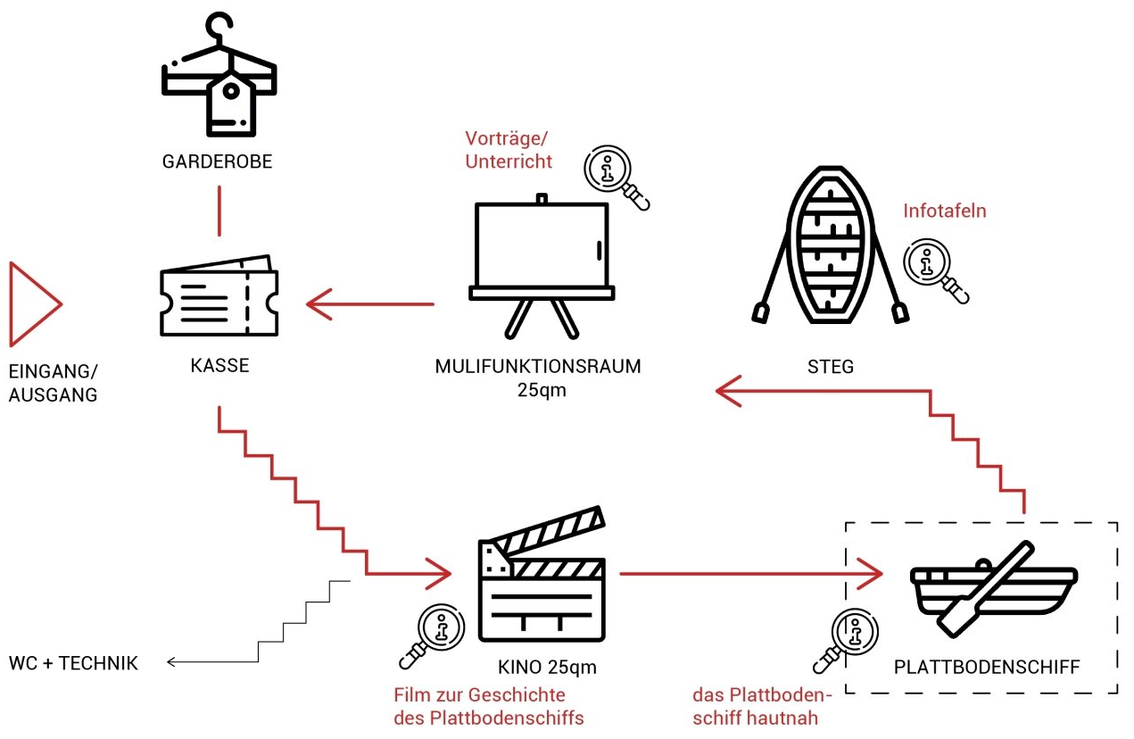 Das "Haus am Deich+" dient als Ausstellungsfläche für ein Plattbodenschiff und schafft Raum für maximal 50 Besucher. Die Organisation funktioniert über einen Rundweg, der im Bestandsgebäude beginnt. Einen visuellen und akustischen Einstieg in die Thematik erhält man im Kino, welches sich im ersten Untergeschoss des Bestandgebäudes befindet. Von hier aus erfährt der Besucher das Schiff im anschließenden Neubau auf Augenhöhe. Von hier aus gelangt man auf das Podest, von dem aus das Schiff von oben begutachtet werden kann. Den Abschluss macht ein Multifunktionsraum, der sich im Bestand über dem Kino positioniert. Hier können Besuchergruppen unterrichtet und Vorträge gehalten werden.