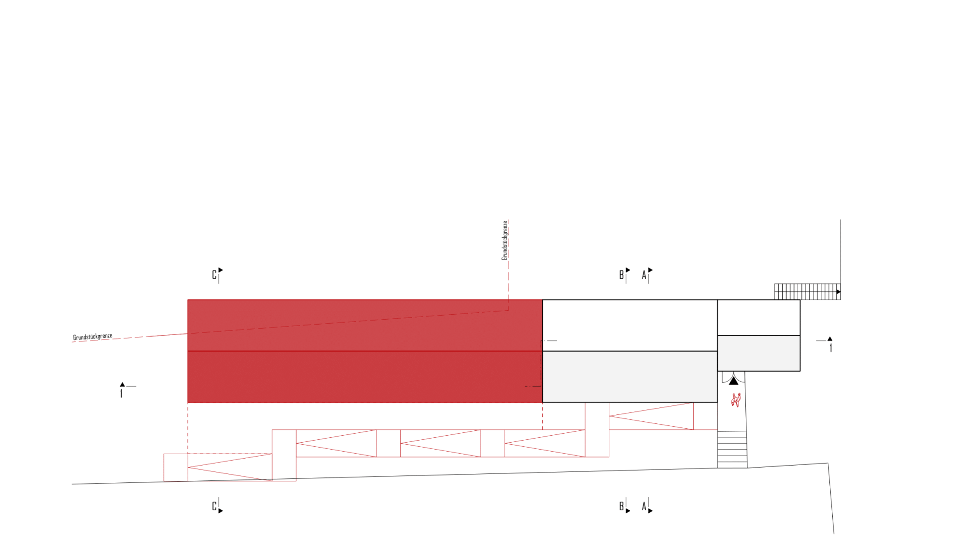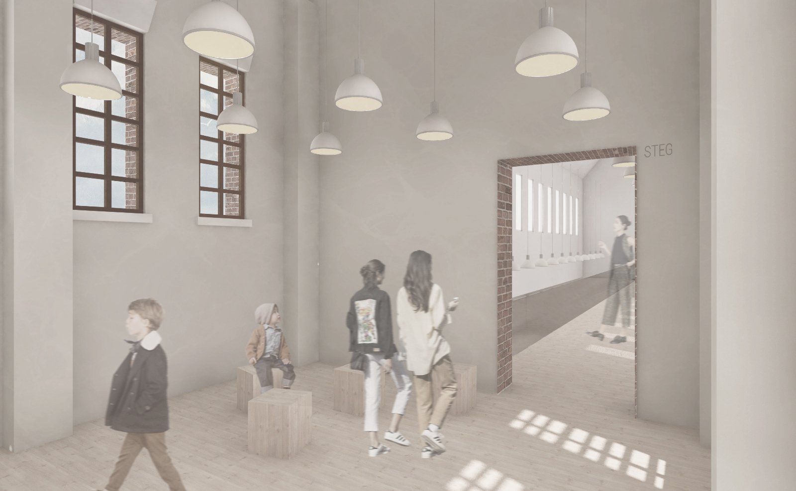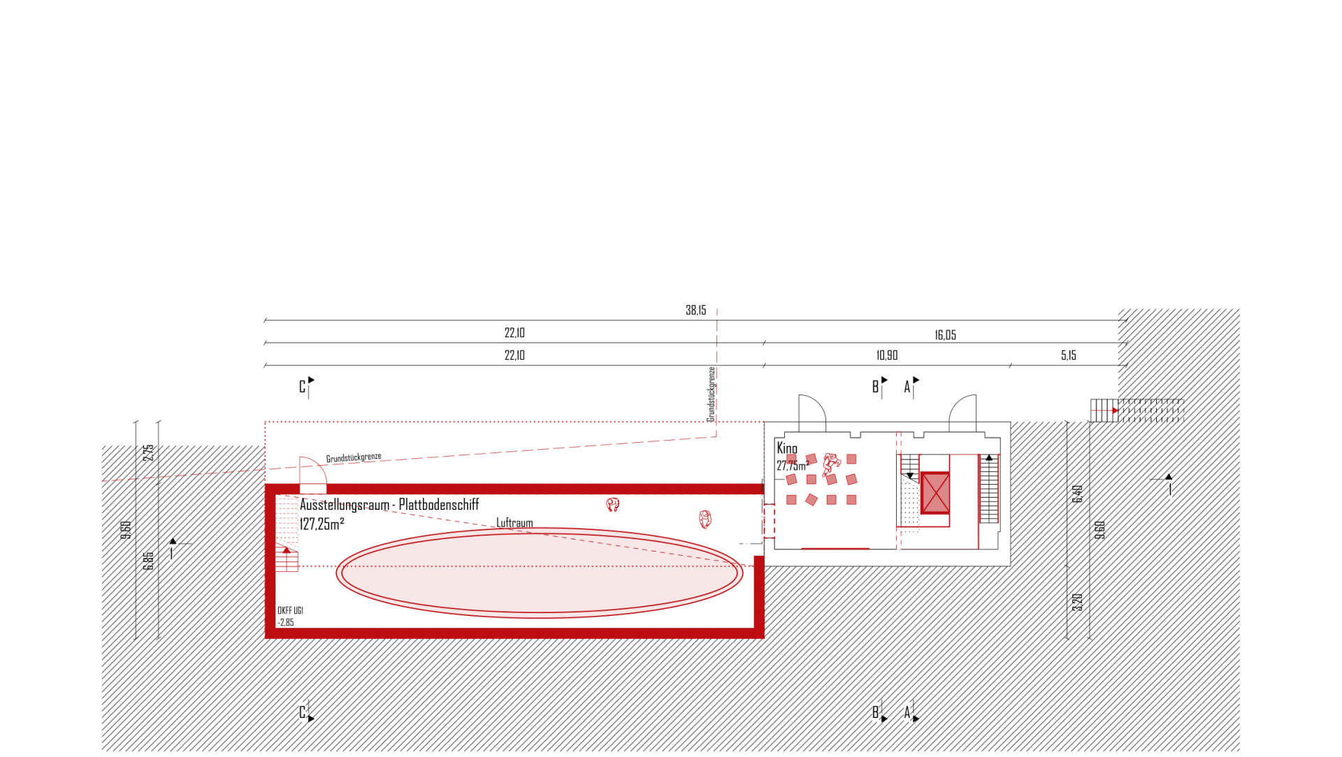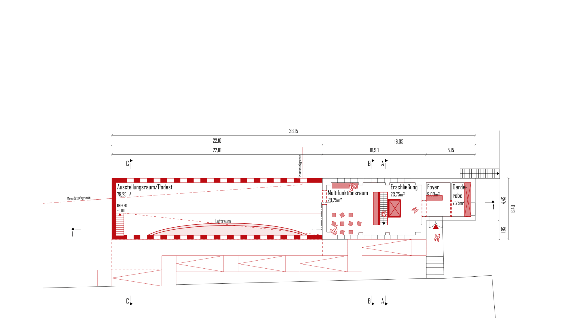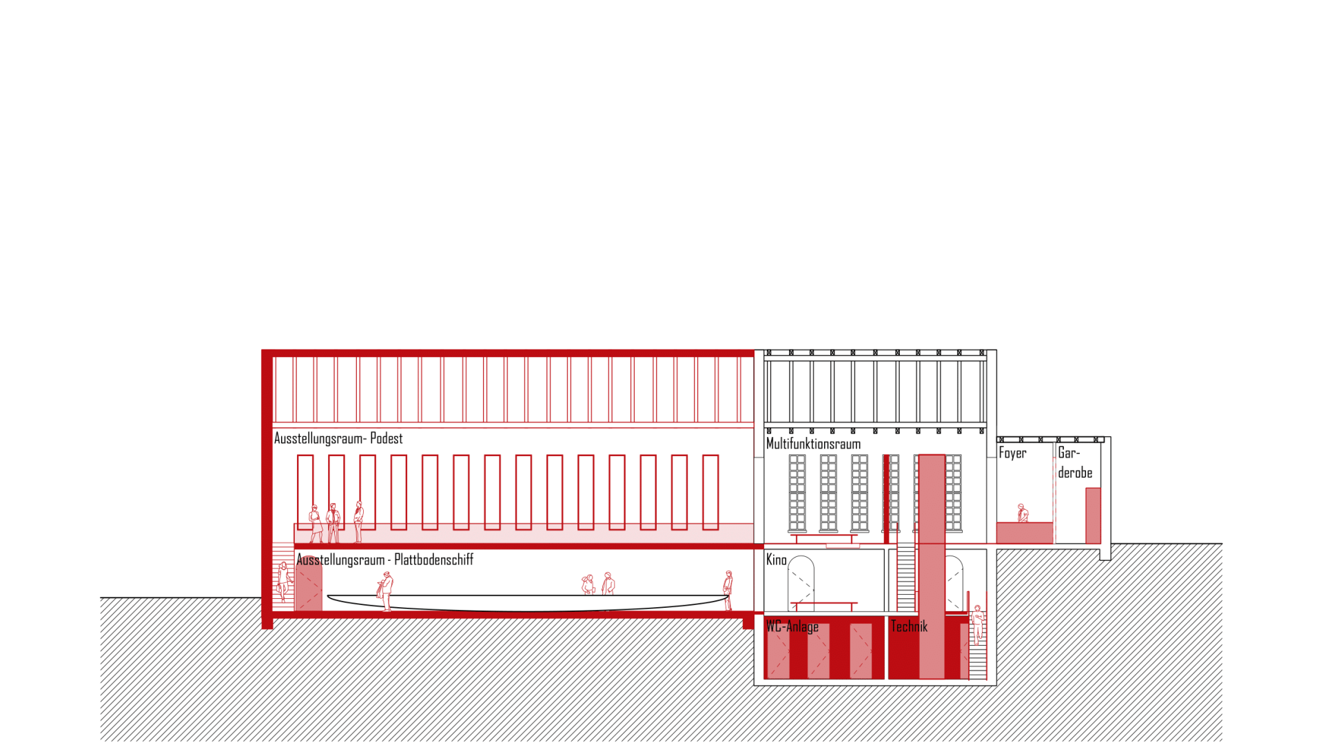 Der behutsame Umgang mit dem Bestand zeigt sich auch in der Raumverteilung. Während sich der Neubau auf die für die Ausstellung nötigen Flächen fokussiert, wickelt der Bestand alle anderen nötigen Funktionen ab. Er ist sowohl Basis für den Entwurf als auch für die Nutzung.