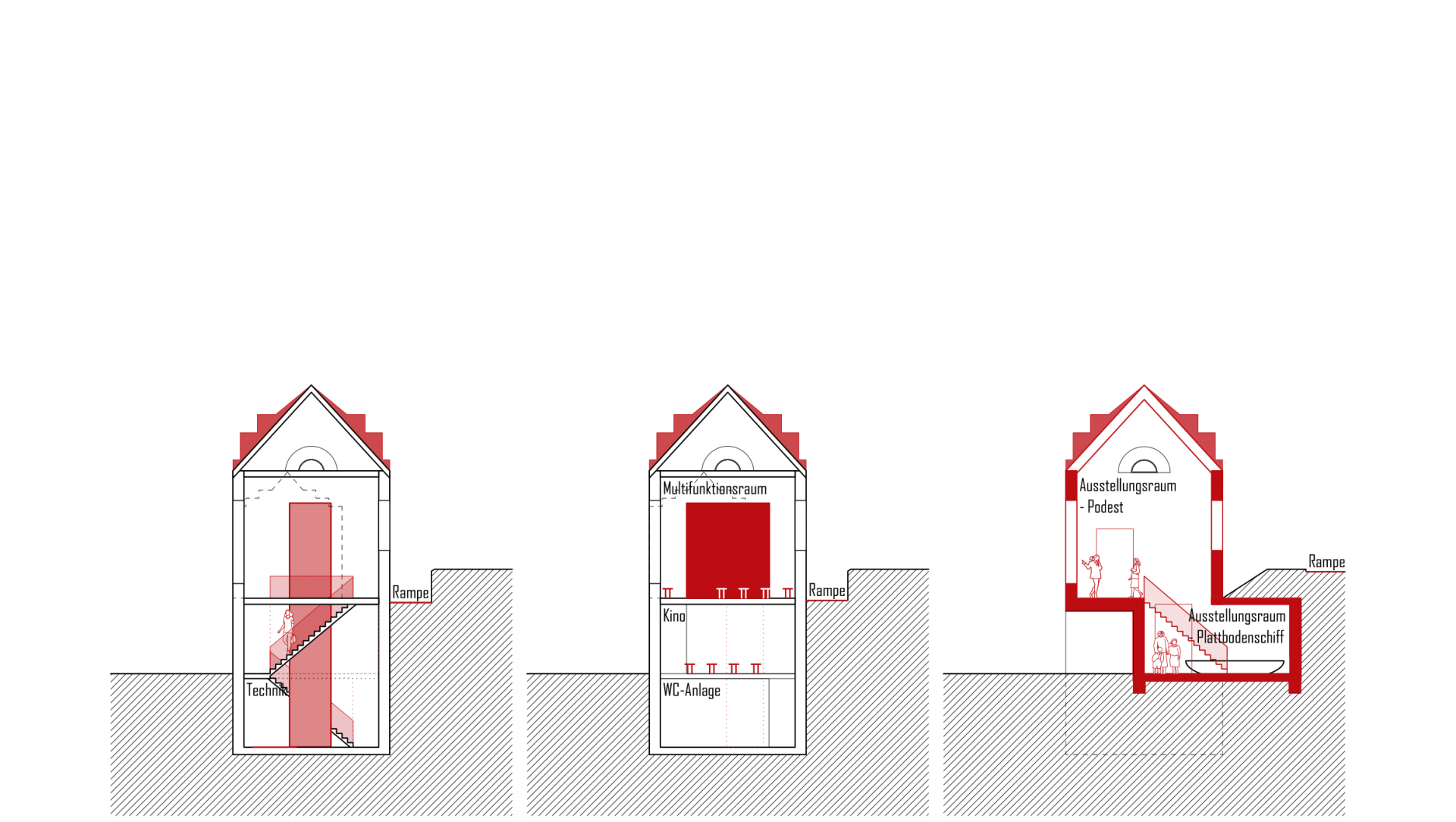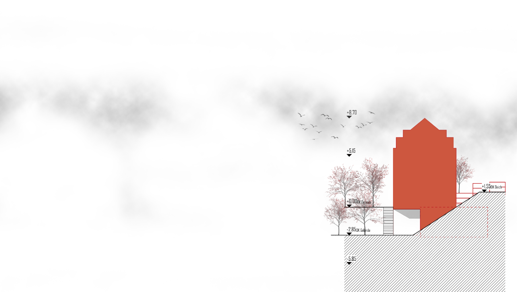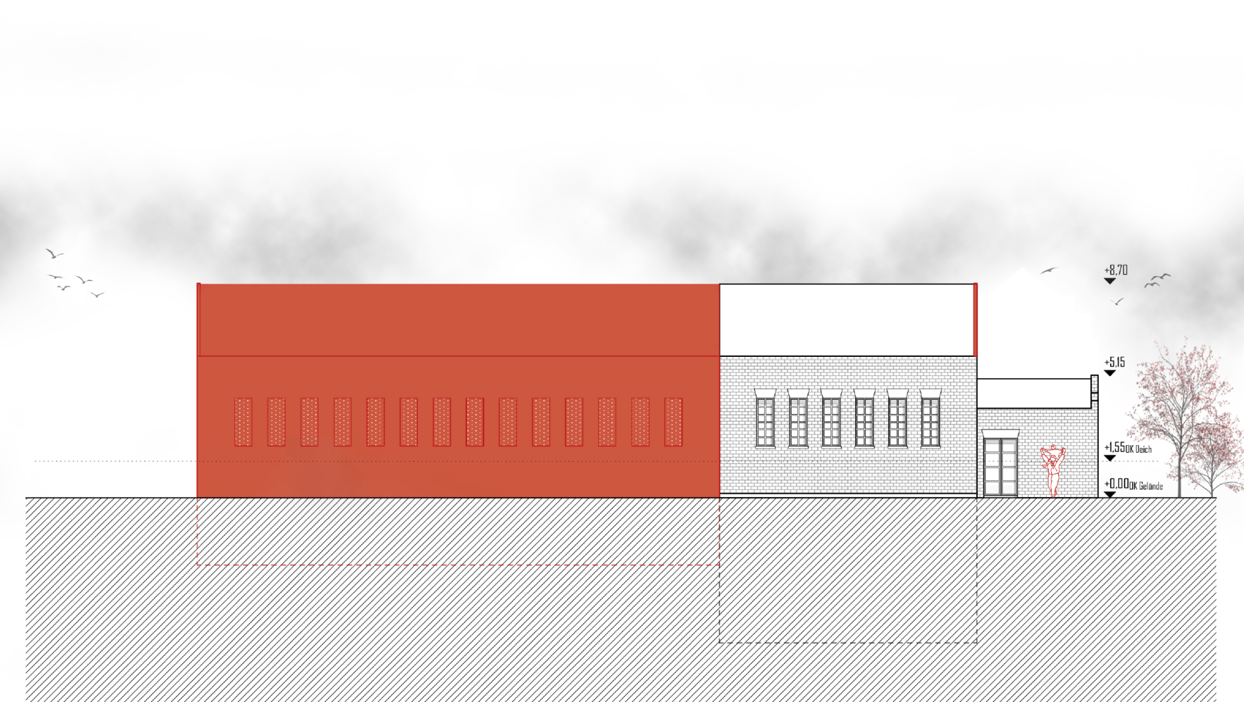 Das neue Museum „Haus am Deich+“ setzt sich aus dem Bestandsgebäude, dem alten Pumpenhaus von Kaiserswerth, und dem Anbau in Form einer Addition zusammen. Die Kubatur und Öffnungen des Bestands werden in der Addition aufgenommen, setzen sich jedoch stark vereinfacht ab, sodass eine eindeutige Ablesbarkeit von Bestand und Neubau gewährleistet ist. Das Untergeschoss schiebt sich zusätzlich in den Deich hinein um so einen geschützten Ausstellungsraum für das Plattbodenschiff zu schaffen.