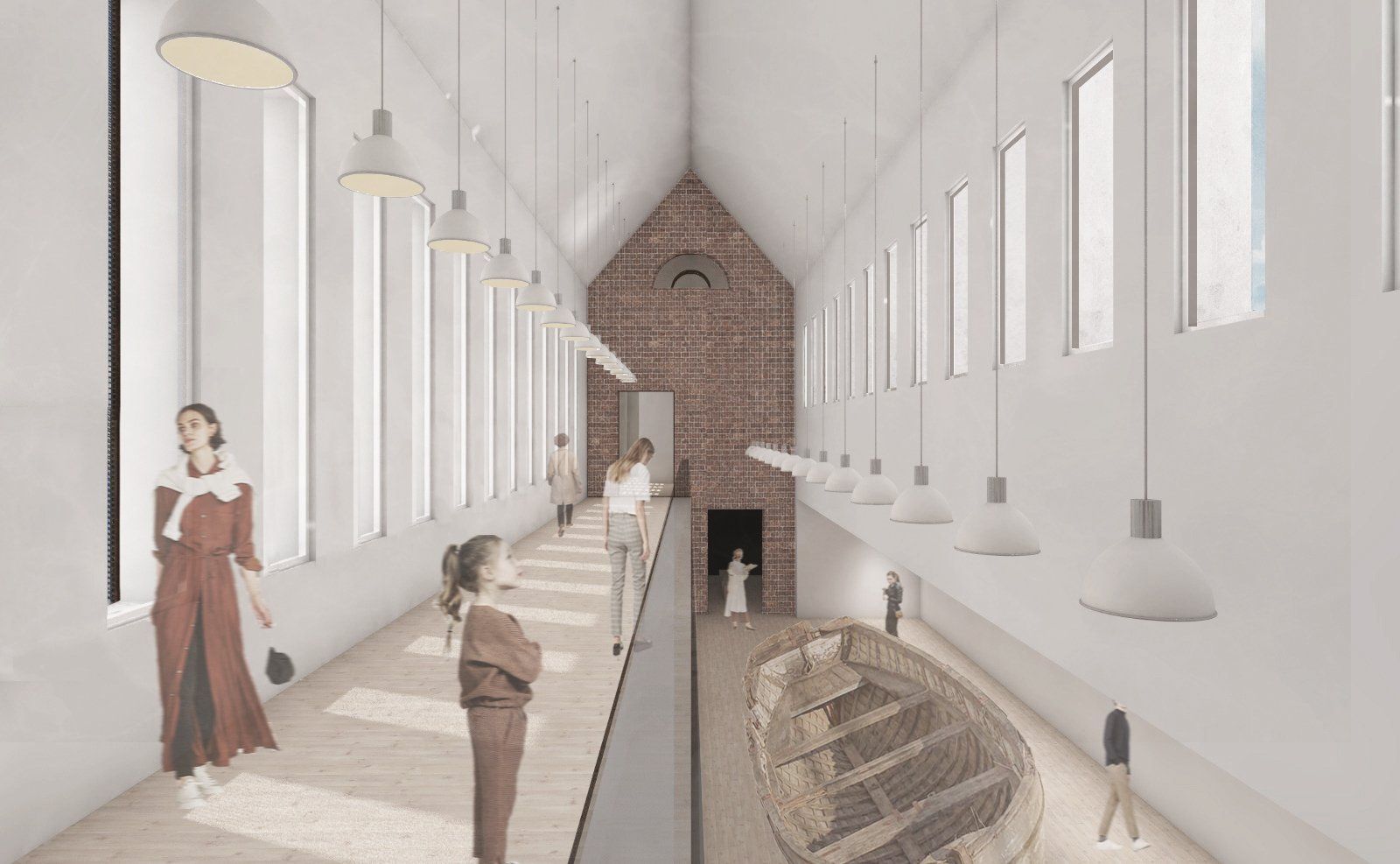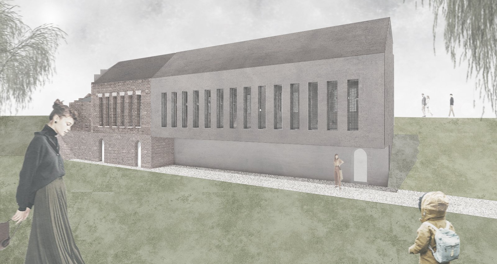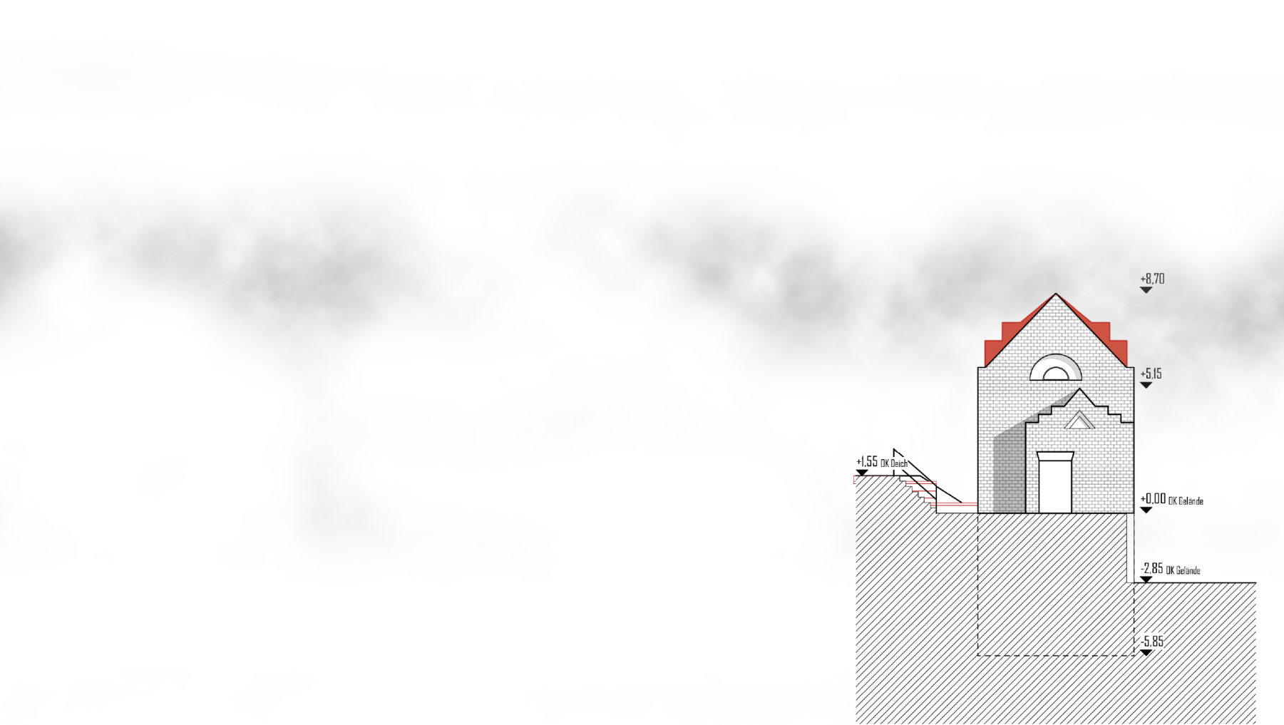 Das neue Museum „Haus am Deich+“ setzt sich aus dem Bestandsgebäude, dem alten Pumpenhaus von Kaiserswerth, und dem Anbau in Form einer Addition zusammen. Die Kubatur und Öffnungen des Bestands werden in der Addition aufgenommen, setzen sich jedoch stark vereinfacht ab, sodass eine eindeutige Ablesbarkeit von Bestand und Neubau gewährleistet ist. Das Untergeschoss schiebt sich zusätzlich in den Deich hinein um so einen geschützten Ausstellungsraum für das Plattbodenschiff zu schaffen.