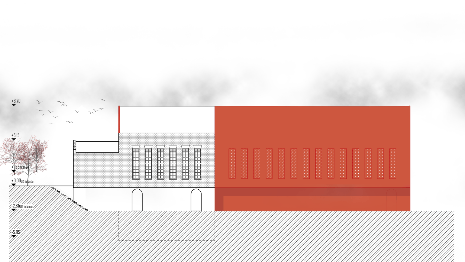 Das rotbraune Bestandsmauerwerk wird freigelegt und die durch vorherige Sanierungen verloren gegangenen Treppengiebel werden nachempfunden und wie "Krönchen" auf den Bestand gesetzt. Alle Ergänzungen werden in Cortenstahl abgebildet, sodass eine klare Ablesbarkeit von Bestand und Neubau gegeben ist.